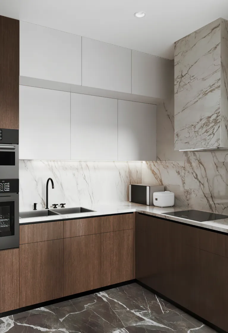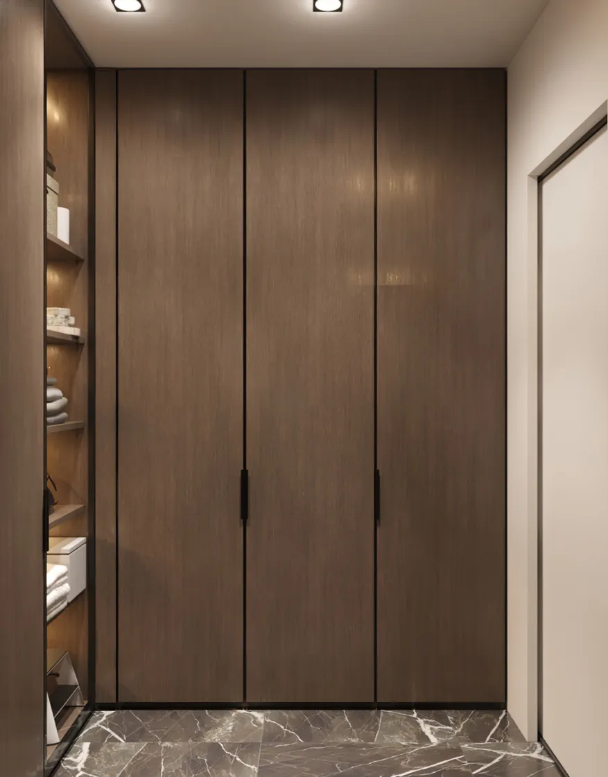 The hallways and entryways set the tone for the entire project with their understated elegance. Marble flooring, combined with dark wood paneling and soft lighting, creates a warm and welcoming atmosphere. Mirrors strategically placed along the walls enhance the sense of space and reflect light, making the corridors feel expansive.
