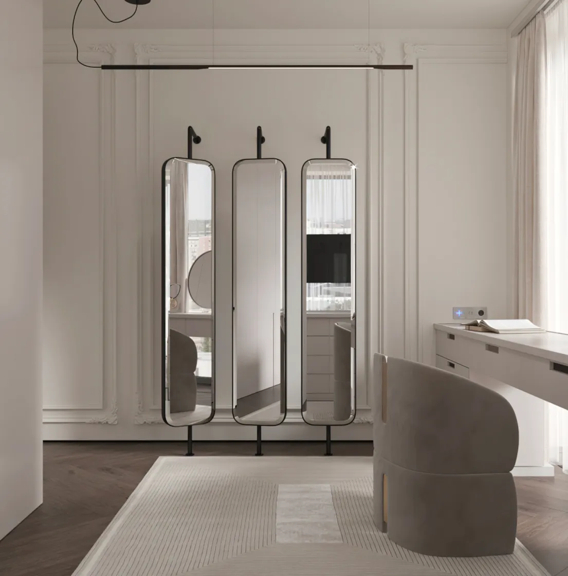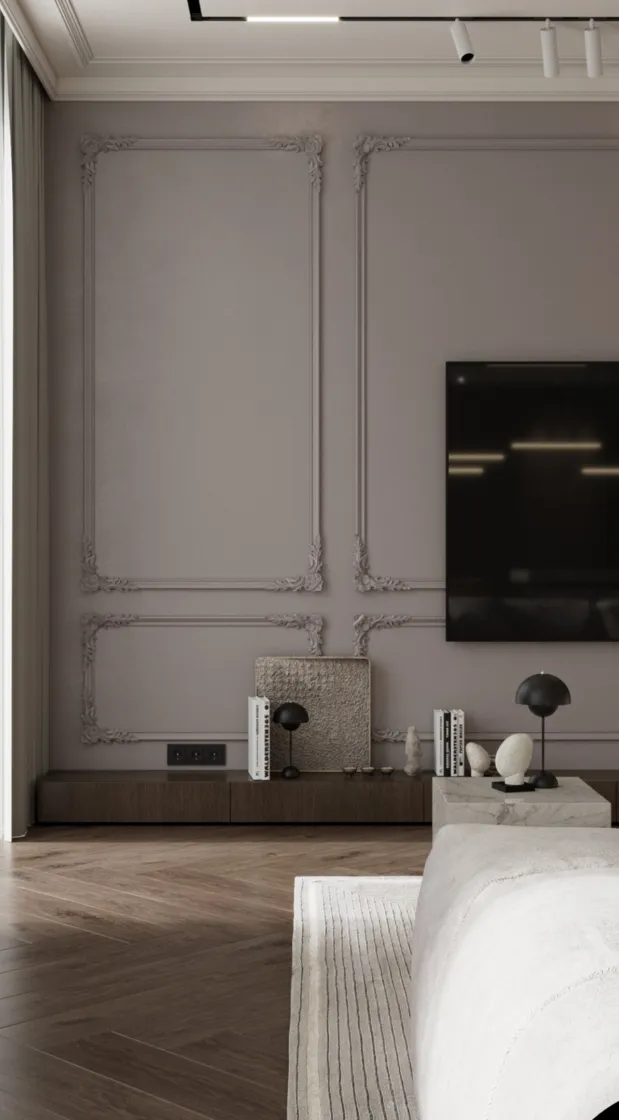 Notable is the detailed paneling on the walls, which adds architectural depth without overwhelming the minimalist decor.