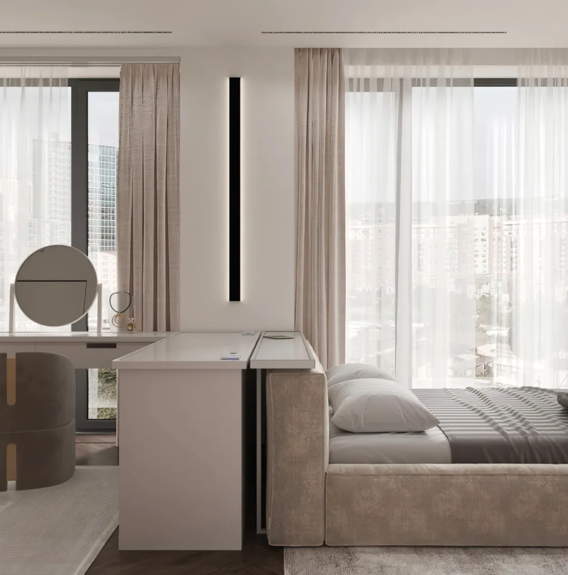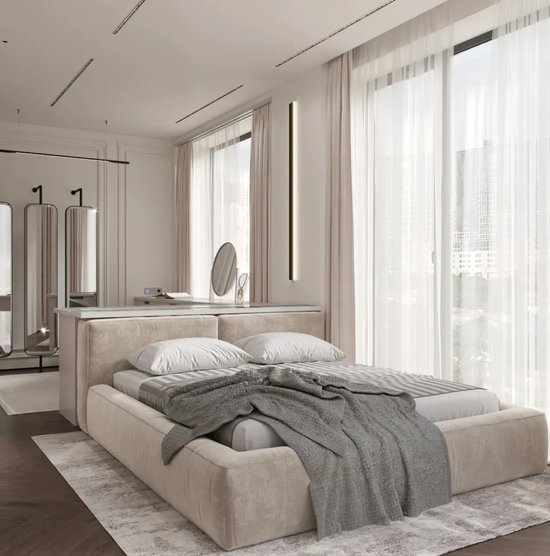 The bedroom design focuses on creating a peaceful sanctuary with subtle luxury touches. Neutral tones dominate, with soft whites and creams setting a tranquil backdrop.