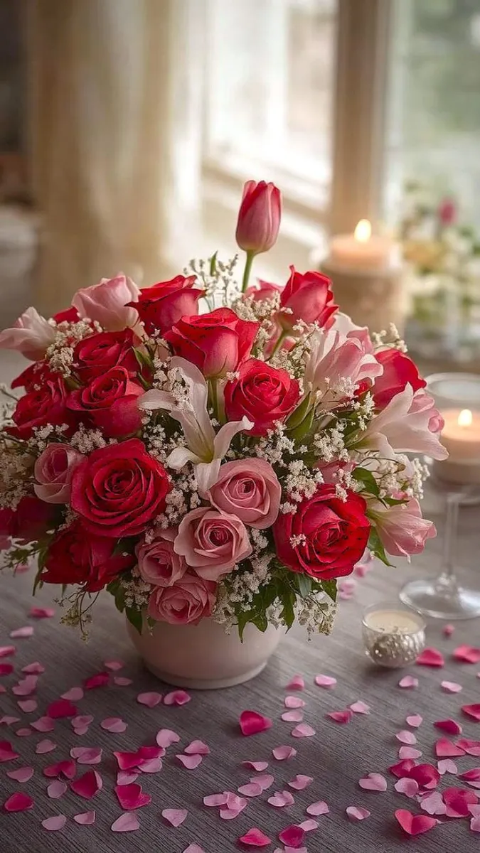 No Valentine’s Day decor is complete without flowers. Go beyond the traditional red roses and experiment with peonies, tulips, or even dried arrangements for a modern twist. Use them in vases, as part of your table centerpiece, or even tied to the back of dining chairs for an elegant touch.